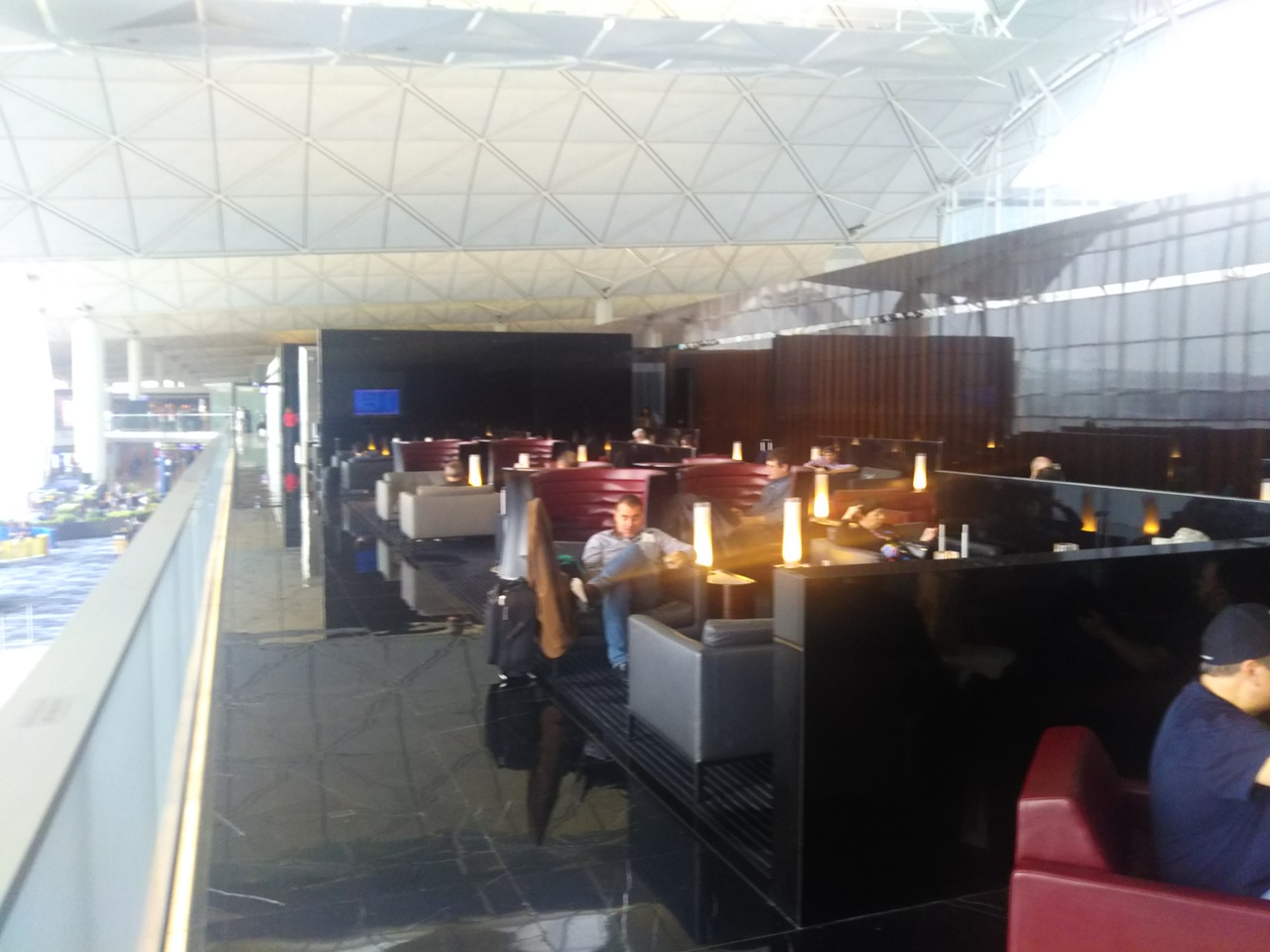 出国審査を経て左手側すぐにあります。バーエリアとビジネスエリア、レストランが分かれていて高級感あります。キャセイのファーストクラスラウンジは、こことサテライト側の2か所にあり、このウイングは場所が良いですが設備は少し限られ、サテライト側のピアは仮眠室やマッサージ等もあり、アラカルトメニューも豊富で充実しています。こちら側のウイングも相当な快適さですが、私は時間がないときはウイングを利用し、時間に余裕があるときはピアを利用しています。