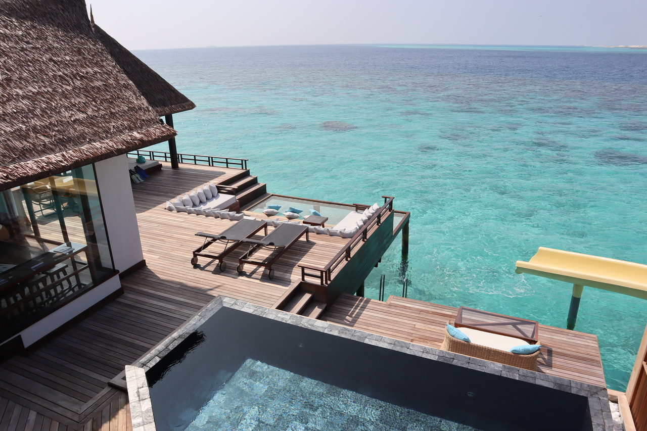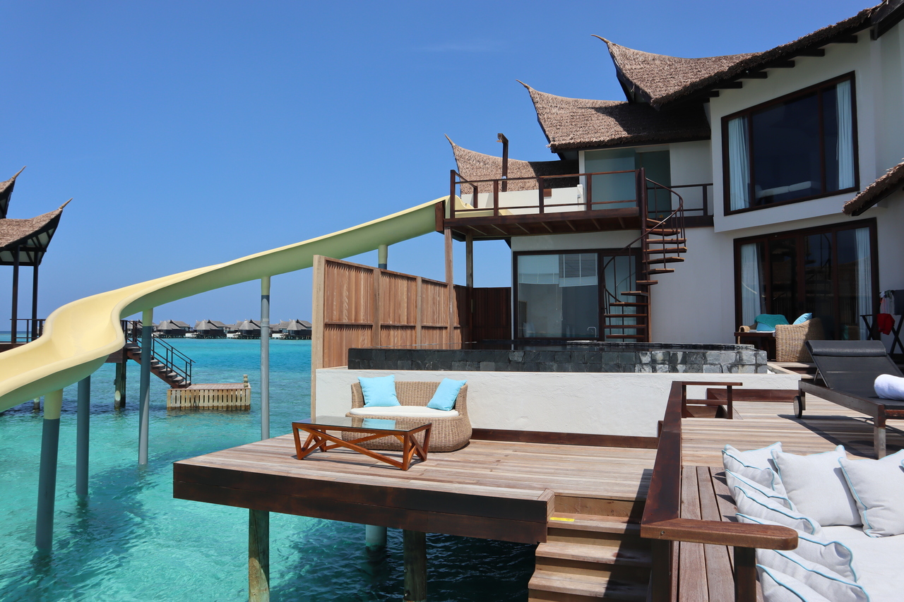 19年1月に7泊しました。スライダー付きのオーシャンリトリートにホテルHPより「スイートメモリーズ」というプランで予約しました。プランでは部屋での朝食が付きました。ルームダイニングのメニューから好きななものを好きなだけ注文できるかたちです。宿泊したスイートは、陸から離れているためボートで送迎してくれます。7室あった、この離れのスイートは、私たちが泊まった部屋以外は改装中でクローズ。朝食~夕食まで、レストランには1回しか行かず、すべてプライベート感満点のテラスで食べました。離れと目の前の海を、7泊独占でき、最高のプライベート感でした。なお、部屋のミネラルウォーターは飲み放題で補充してくれます。エスプレッソマシーンや紅茶などもあり充実。アメニティも日焼け止めやアフターサンローション、歯ブラシなども備わっていました。