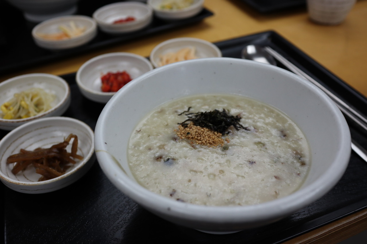 ミョンドンにある有名お粥店。ビルの2階にあり、朝8時くらいから行列ができていました(GWだったので7割型日本人)。食べたのはアワビ入り粥で1000円くらい。人気店に違わぬ優しく美味しいお粥でした。ボリュームも十分。メニューは日本語ありで、店員も日本語上手でした。