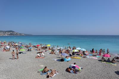 ニース海岸線数キロメートル続くビーチ。砂浜でなく、石でできた石浜です。誰もが入れるパブリックエリアでは、地元の人がレジャーシート等持参で日光浴を楽しんでいました。東京近郊のようなイモ洗い状態ではなく、スペースもゆったりしていた感じです。有料のプライベートエリアはシャワーやデッキチェア、パラソルなどが備わるものの、前後左右のチェアは結構近めです。全体的に入るよりも、景観のアクセントや主役となる、眺めて楽しむ美しいビーチという印象を持ちました。