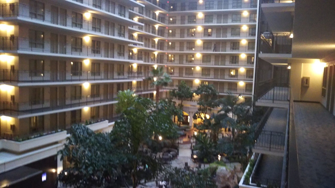 全部屋リビングとベッドルームが分かれた、スイートタイプのホテル。窓からは眼前に海と、遠くにサンフランシスコ国際空港が臨めました。吹き抜けの中庭(屋根付き)には木が植えられ、リゾート感あるエアポートホテルでした。