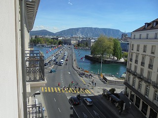ジュネーブ中央駅(コルナヴァン)から徒歩5分ほど。モンブラン橋近くに建つホテルです。今回の部屋は、横側に橋とレマン湖を望めました。湖正面ではありませんが、それらホテルと比べると価格は格段にリーズナブルかと思います。規模も大きくないため、アットホームさがありながら、伝統的な雰囲気やフォーマルさも保たれています。朝食も美味しいです。