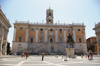 ローマ時代には神殿がおかれ、その後ミケランジェロが設計したカンピドーリオ広場の正面に建つのが市庁舎。市庁舎目の前にはマルクス・アウレリウスの騎馬像が置かれている(コピー。本物は美術館内)。市庁舎はオレンジ色の壁と左右対称の造りが印象的。