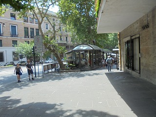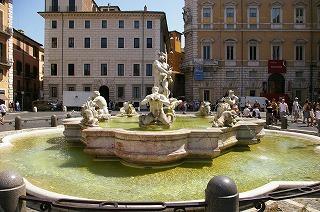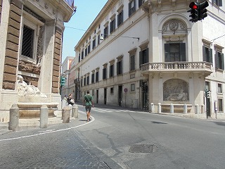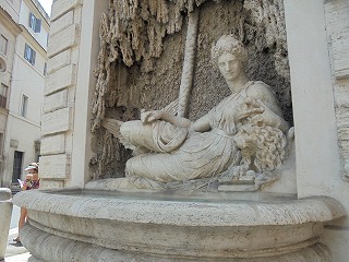 バルベリーニ宮の近くにある噴水。直角に交わる道路の四隅に、それぞれ噴水がある。訪問時は7月の酷暑で、かつ坂道を登ったところにあったので、噴水が涼しげでよかったです。噴水の一つには、ボッロミーニが手掛けた教会も併設されていました。