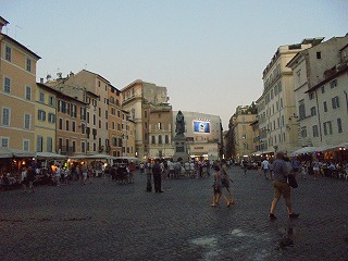 昼間はカンポ・デ・フィオーリ広場に露店が出て、オリーブオイルやパスタなどお土産に適したものも含めて、市場を形成していました。が、値段も分かりにくく、スーパーマーケットで代用できると思いました。広場周辺は、小道に、庶民的ですが、雰囲気良さそうなレストランが多くありました。