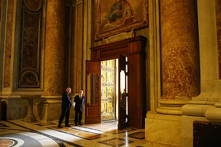 朝7時から入場できます。手荷物検査の列も、待ち時間ゼロでした。クーポラには8時から登れるとのことだったので、先に聖堂内部を見学しました。2016年は特別聖年に当たり、16年ぶりに聖なる扉が開かれていて、そこから入場できました。