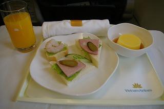 ベトナム国内線、ビジネスクラスを利用しました。ダナン空港ではビジネスクラス用のチェックインカウンターで並ばずにチェックイン、国内線でもビジネスラウンジが利用できました。行きのダナンまでの便はシェルフラットシートでしたが、帰りの今回の機材は古めで、シートは普通にリクライニングするものでした。夕方便でしたが、食事は簡素な軽食のみでした。