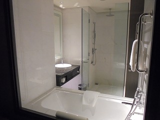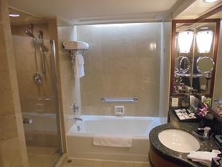 アドミラリティ駅直結のパシフィックプレイスにあります。宿泊代は一泊2,800ドル++と4万円超。部屋は2面に大きな窓があり眺望は良好。バスルームはバスタブとシャワールームが別々にあります。シャワーの湯量も満足でした。チェックイン後にウエルカムティとフルーツのサービスもあり、快適で質の高い滞在ができました。