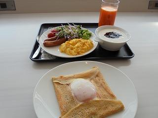 朝は利用者多く結構混雑しています。食事はビュッフェスタイルですが、中央の調理台で朝はガレットを作ってくれます。無料Wifiと、至るところに電源プラグがあるのが助かります。今回は利用しませんでしたが、無料の靴磨きやマッサージサービスもあります。