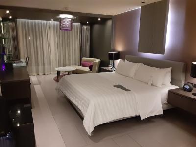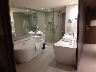 深夜到着で、チェックイン時に希望の禁煙ルームが僅差で完売してしまった。フロントスタッフが素早く対応してくれて、何とスイートルームにアップグレードしてくれた。部屋はキッチンやダイニングテーブルも備わっていて申し分なし。朝食も充実していた。ショッピングモールも隣接していて、立地も良かった。