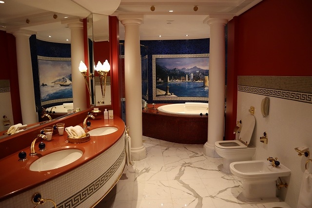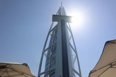 ホテル利用者しか入れない橋を通ってホテルに。ロビーから豪華で、巨大水槽には魚が泳いでいました。部屋はメゾネットタイプの2階建て。部屋の広さや豪華さも申し分ありませんが、特にバスルームのデザインや色調が素敵でした。宿泊者は朝食付きとなりますが、朝食も豪華で美味しかったです。スタッフの対応も完璧。噂通りの超豪華で、素晴らしいホテルでした。