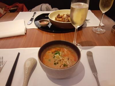 出国審査を終えてすぐの場所にあるキャセイパシフィック航空のファーストクラスラウンジ。レストランエリアは、席も指定され、レストランのよう。アラカルト数品とビュッフェの組み合わせ。シャンパンバーでは、優雅な雰囲気でドリンクを楽しめる。場所が良く、超快適でした。