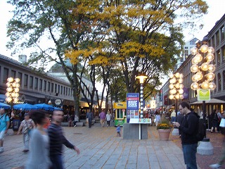 ファニュエルホールの目の前に広がるエリア。広場に長屋のように洒落た店が並んでいるような感じです。車が入ってこないので、のんびり散策できます。一時のブームは去りましたが、3階建てのアバクロもあります。夜でも人通りがあり、賑やかなエリアです。