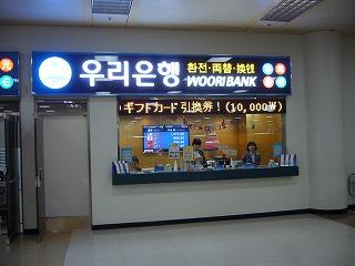 金浦空港には入国時は税関審査後、出国時は出国審査後に、それぞれ銀行の両替所があります。円とウォンの両替レートは、売り買いで約10%の差がありました(円→ウォン、ウォン→円で、各5%程度)。日本で両替するよりは多少有利かと思います。