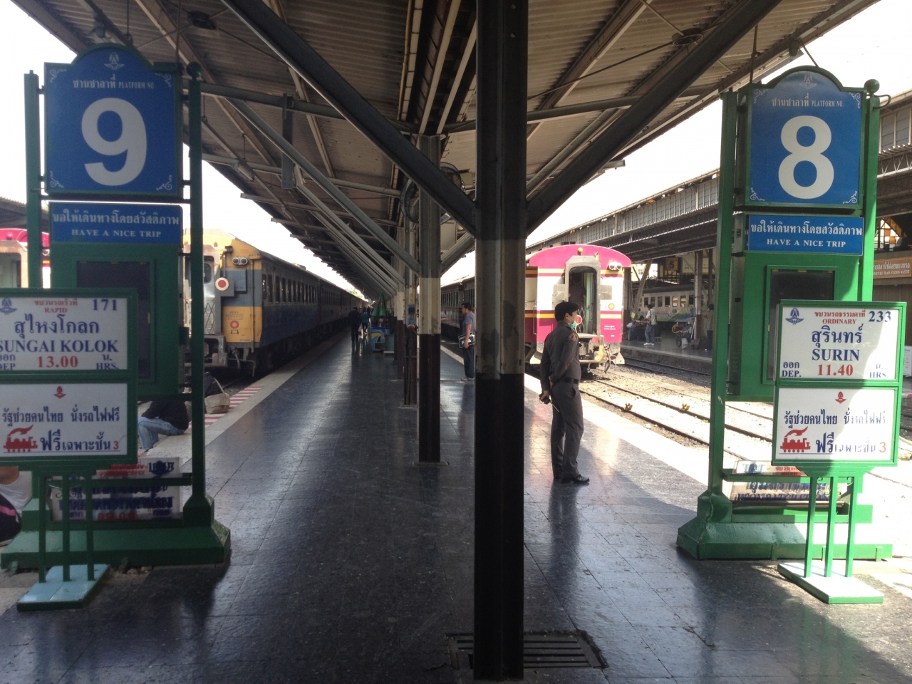 タイ国鉄のバンコク中央駅。国鉄駅のホームは1階にあって、全部のホームが直接駅の入り口につながる形になっているので、階段がなく、荷物を持っての移動にも便利です。(ホームと列車との間には少し段差がありますが…)