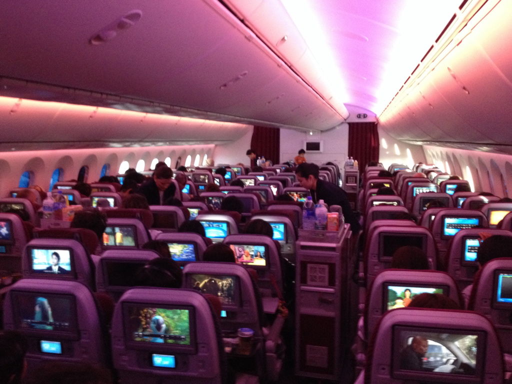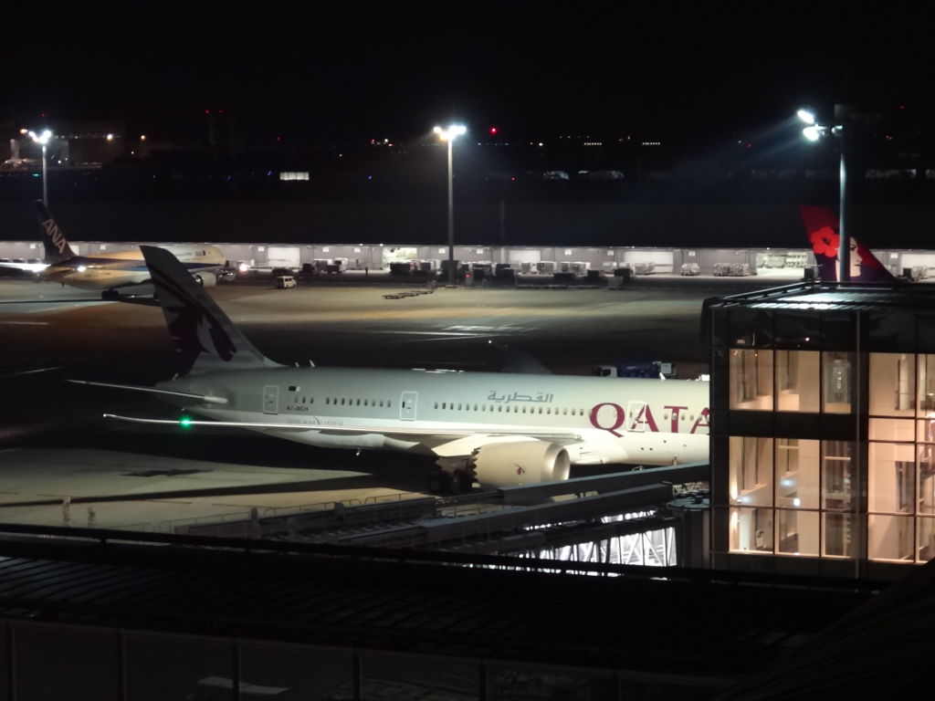 羽田ードーハ間の機材はB787ですが、座席指定の時に配列が標準より1列多い9列とわかって、狭いのかなと心配していました。往復ともフライトは満席に近い状況でしたが、少なくとも通路側は、それほど窮屈な感じはありませんでした。でも配置が3-3-3ですので、窓側の席はちょっと窮屈なんじゃないかと思います。またドーハから先で乗ったB777などと比べるとやっぱり少し狭いような気がしました。