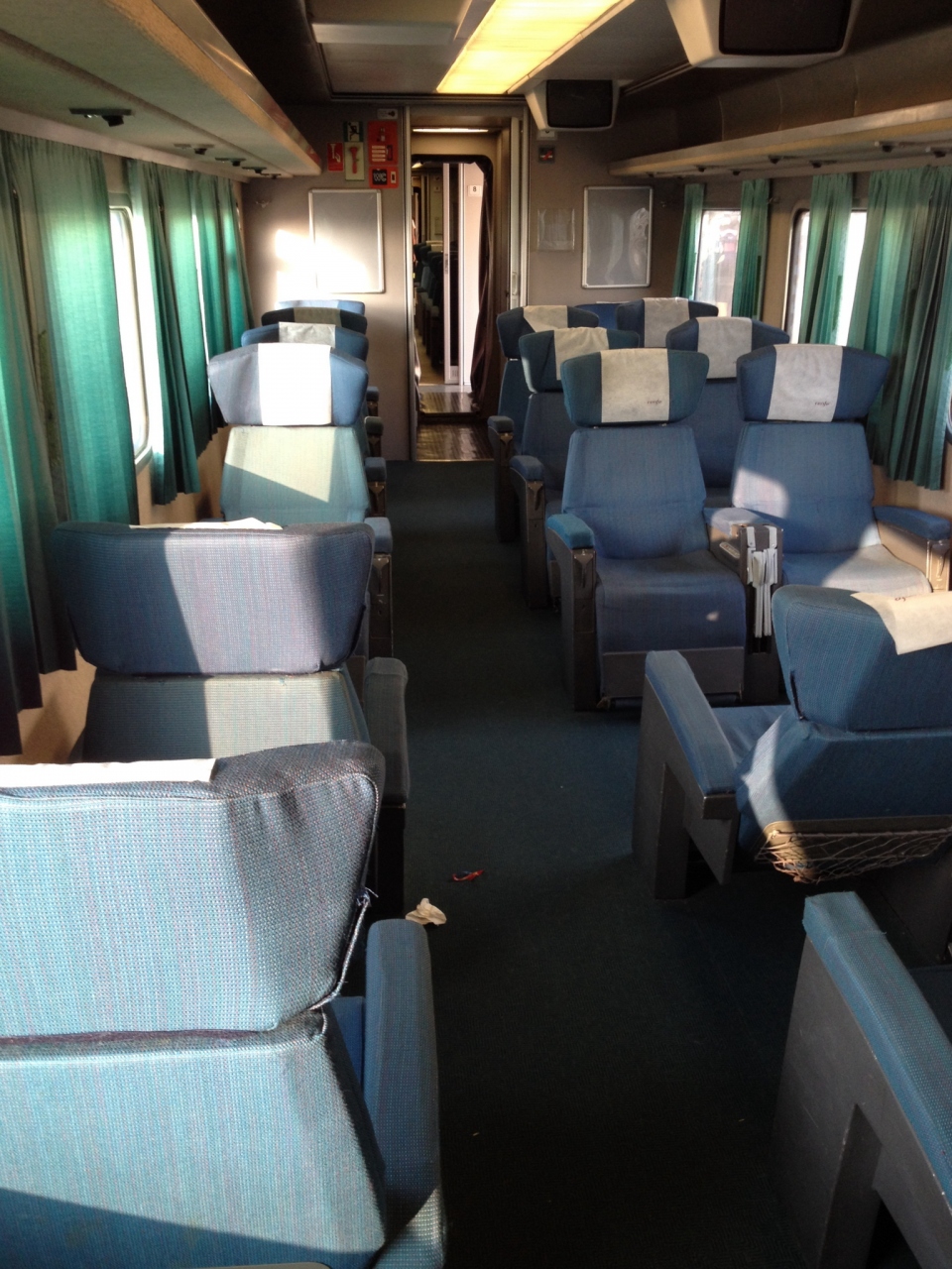 当日マドリッド、チャマルティン駅に行ってみると、改札口はなく、案内板を見て直接ホームへ。2等(Turista)のはずが、指定の9号車は1等(Preferente)の車両になっています。そして予約の時に座席表を見て01A席を指定していたのですが、車内の席番号は01,02,03と数字だけです…スペイン人の友だちが見送りに来てくれていたので、車掌さんらしき人に聞いてくれましたが、とりあえず車両はここで間違いないと…そして2+1配列の1のほう、03番の席に座ってくれとのことです。なんとなくスッキリしませんでしたが、一応同じ車両の人全員に席が割り当てられて、無事出発しました。一人がけの座席は大きくてそれなりに快適。これはラッキーだったのかと思い、早々と寝ていました。ところが…