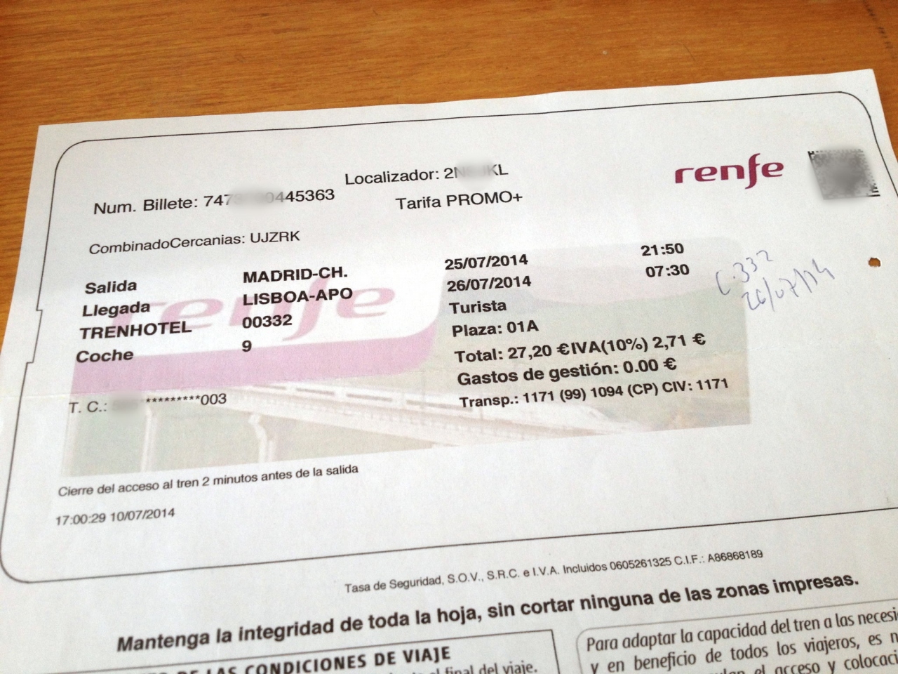 グランクラス、個室寝台、2等寝台と2等座席があります。予算の都合で2等座席を選択…列車はスペイン側のrenfeが担当しているようで、チケットは方向にかかわらずrenfeのサイトで予約・購入できます(英語可)今回は早めに予約したので、27.2ユーロで買えました。チケットにはTRENHOTEL00332と書いてあるだけで、Lusitaniaという名前は書いてありません。