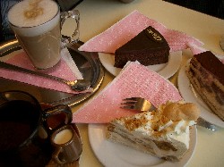 写真は私達がAidaで頼んだケーキ3つ(2人で行ったけど、3つ!)とメランジェ&紅茶。ティラミス・バナナのケーキ・ザッハトルテです。ケーキもコーヒーも安いし、種類もたくさんあるので私のお気に入りの一つです。ちなみにウィーンに来たら、普通のコーヒーじゃなくて「メランジェ」に挑戦してくださいネ♪- 旅行時期