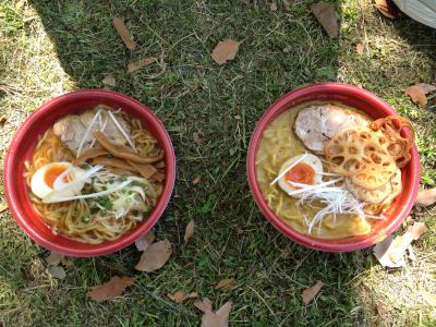 土浦C-1グランプリなるもので麺部門を受賞したというカレーラーメン(600円)と醤油ラーメンを注文。カレーラーメンはレンコンチップと煮卵とチャーシューとネギがトッピングされていました。スープはそんなに辛くなく、子供でも食べられそうでした。店舗だと辛さが選べるのかな?麺はもちもちした中太麺で、スープが良く絡んでました。チャーシューも柔らかくて美味しかったです。