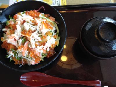 かにほぐし身、いくら、さけ、どびっこ、きゅうりなどが乗った丼です。