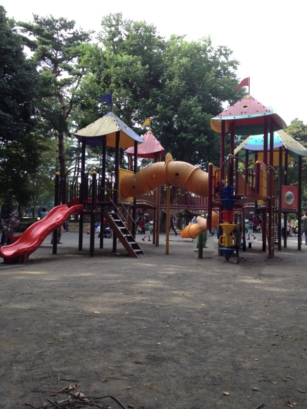 大きな滑り台の遊具がある冒険広場には幼児・小学生(低学年)の子供たちが楽しそうに遊んでいます。すぐ近くにトイレ、ジュースやアイスの自動販売機があるのも便利です。日陰もそこそこあり、ベンチもたくさんあります。