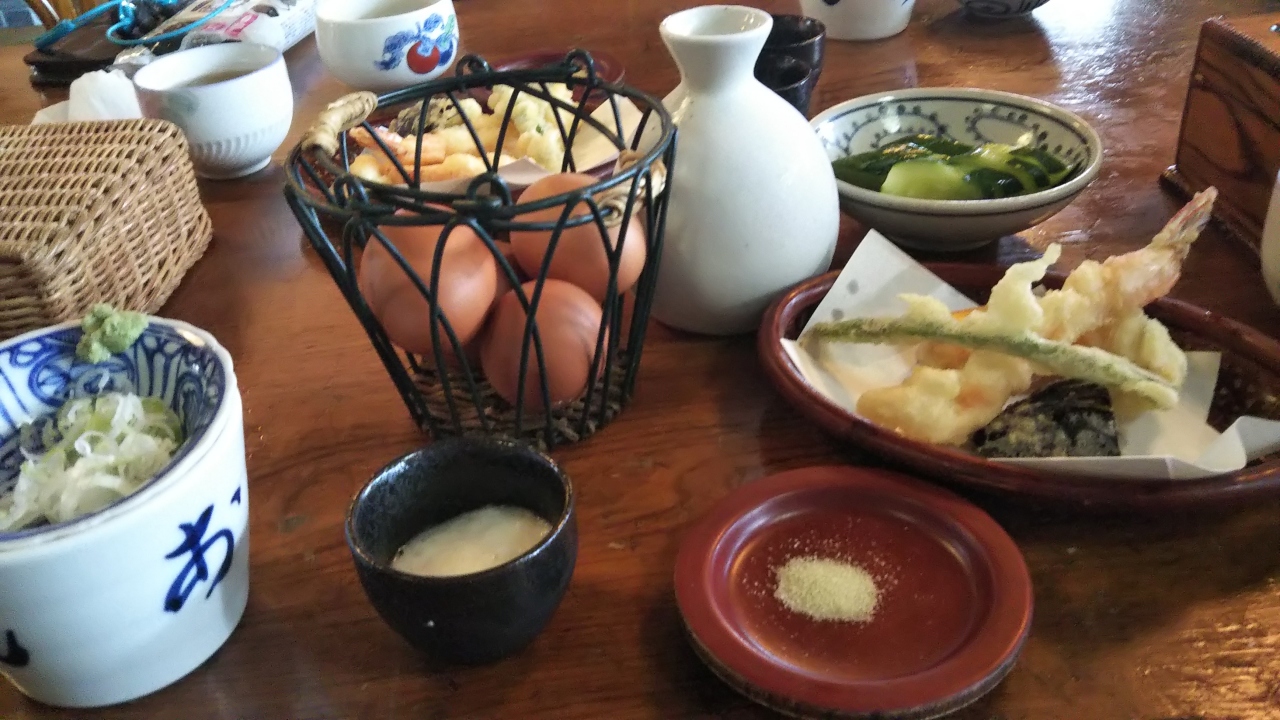 老夫婦が切り盛りされている様子。奥さんが気さくに話しかけてくれ、注文を取ったり料理を運んだりしていました。皿蕎麦と天ぷらのセットを頼みました。きゅうりの漬物と生卵ととろろが付いていました。先に来た天ぷらはカラっとしてサクサクで美味しかったです。蕎麦とつゆは正直あまり好みではなかったです。壁に蕎麦30枚とか40枚とか記録が書かれていたのですが、そういう大食いチャレンジ的な店なのかな?- 旅行時期