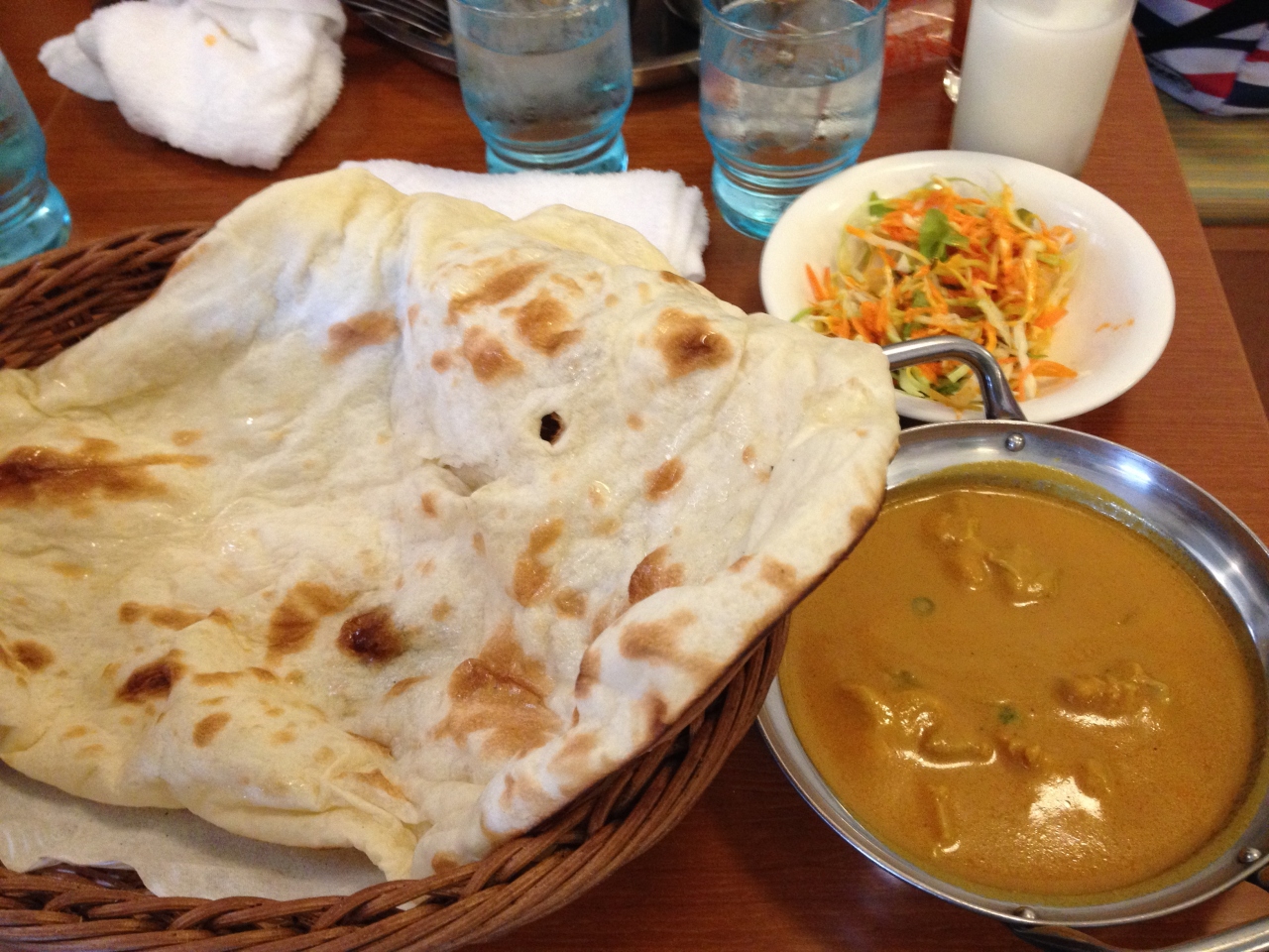 カレーの辛さは5段階くらいから選べますが、テーブルにチリパウダーが置いてあるので、自分好みに辛さを足すこともできます。カレー自体は癖のない味だと思います。サラダは野菜の千切りにオレンジ色のドレッシングがかかっています。酸味の少ない、食べやすいサラダです。ナンは顔の二倍くらいある大きさで、もっちりしたところとパリパリしたところがあって美味しい。熱々で提供されます。ナンとライスはお替り自由。