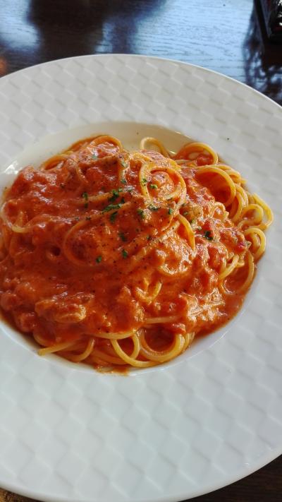 そしてランチメニューから、看板メニューの生うにとトマトのクリームパスタのセットをオーダーしました。セットのサラダは自家製ドレッシングがおいしかったです。お店で販売もしてるみたいです。メインのパスタは、トマトの酸味とうにの濃厚さが合わさった、美味しいパスタでした。