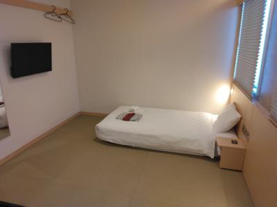 部屋は畳敷きで3畳ほど。寝るにはまあ十分です。ただ、壁が薄いので隣の音は気になりました。それでもテレビと冷蔵庫、エアコンもついているので設備も意外としっかりしています。