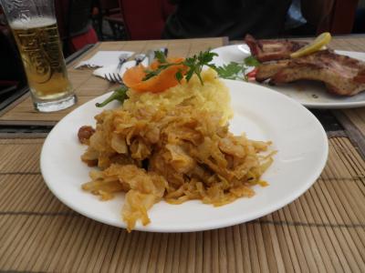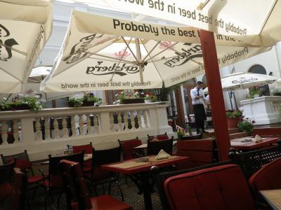 旧市街の中ですが地下鉄駅からは 少し歩きました 大きな通り沿いでは有りません 脇道を入り少し歩いた所に有ります 場所を確かめていかなければ少し分り辛いかも? 庶民的な所を想像して居ましたが ホテルのレストランの様にお洒落で綺麗で 雰囲気も良い感じです 夏場なのでガーデン形式のパラソルの下でいただきました メニューも皮で出来て居ました どちらかというと高級レストランという感じです メニューですが結構幅広いです お勧めにはシェフの帽子のマークがついている様です ビール (500ミリリットル)1本と お勧めマークが付いた 写真もついていた ポークリブグリル(550グラム)とサルマーレ(ルーマニア風ロールキャベツン650グラム)で 一人900円位でした 少し少ないかも?と思ったのですが 付け合わせのマッシュポテトが山盛りでお腹いっぱいになりました