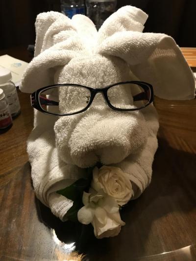 またもやタオルを使ったワンちゃん。眼鏡は主人のものですw