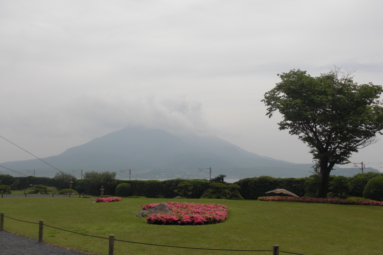 空が広くて、庭園の散歩は気持ちがいいし、ぼんやりしか見えなかった桜島が、