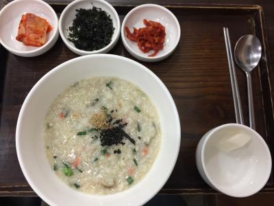 画像のアワビのお粥セット15000ウォン(¥1500)。私の朝食にしては高めかな。