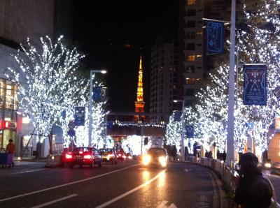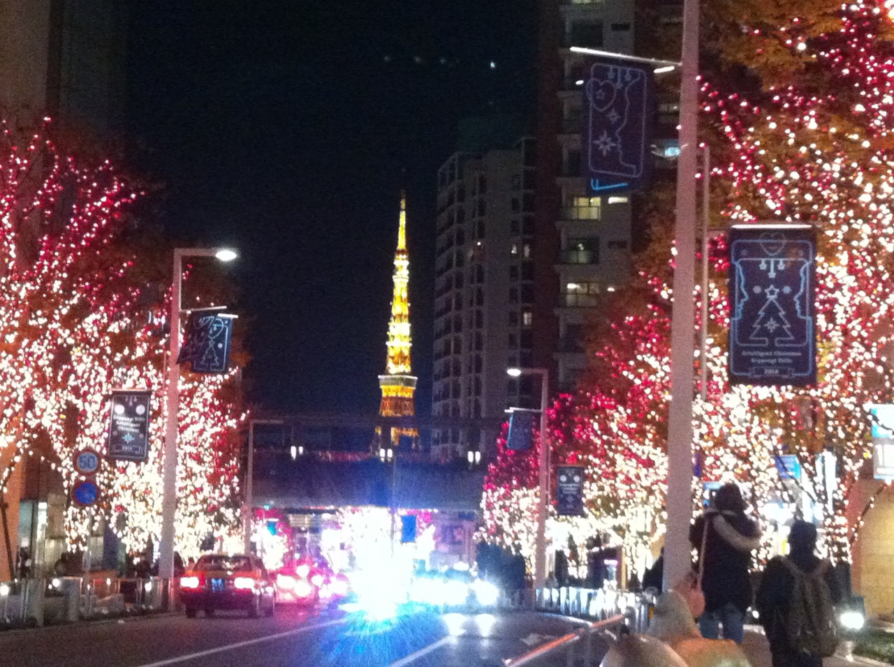 六本木ヒルズ けやき坂から東京タワー方面へのクリスマスイルミネーション。1時間に1回5分くらいイルミネーションの色が青から赤に変わるそうです。タイミングが良いと両方のイルミネーションを見ることができます。偶然2色撮影できました!