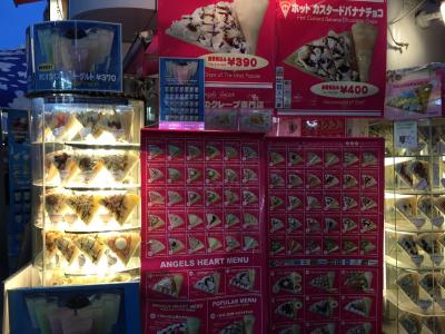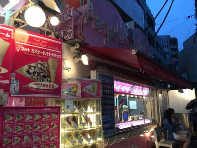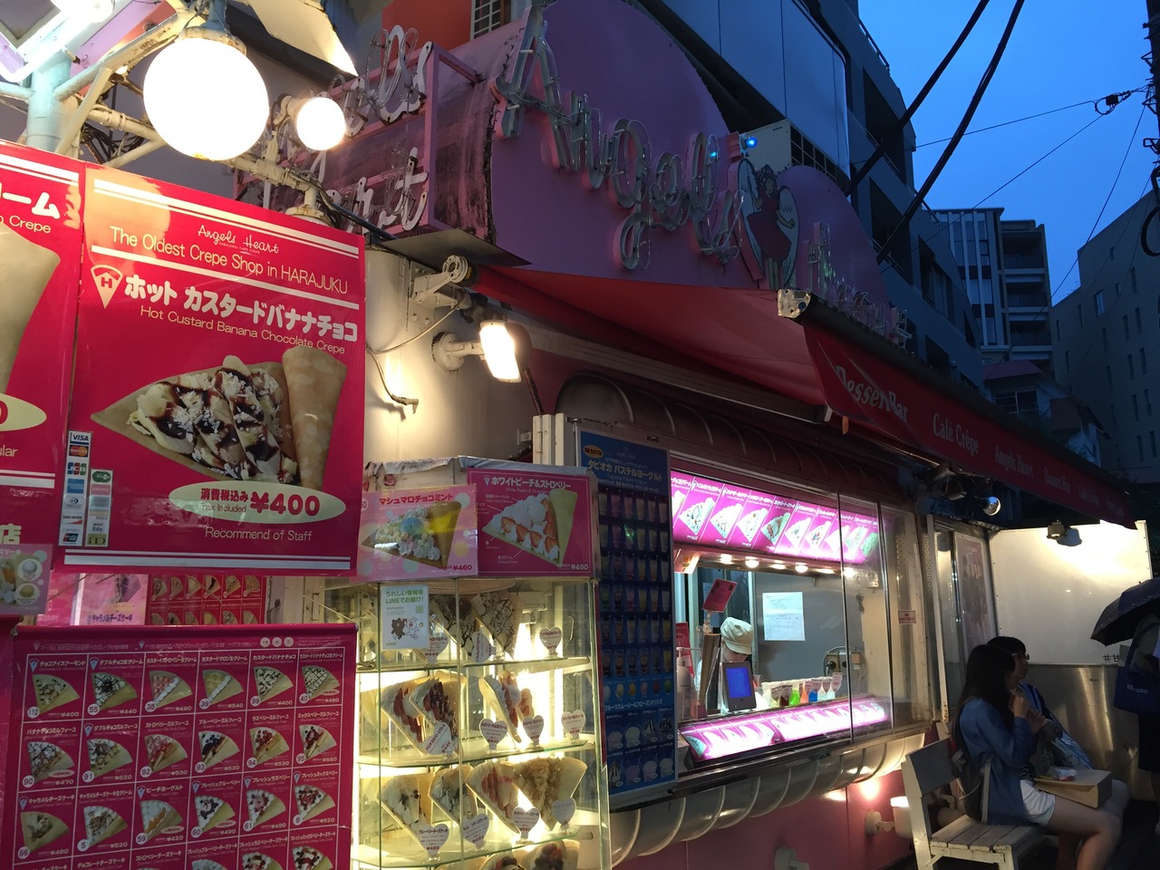 竹下通りの真ん中あたりにあるピンク色の外観のお店です。いつも数人並んでいます。メニューがたくさんあって、どれにしようか悩みます!期限のないスタンプカードがあり、スタンプが8個たまると\590以下のクレープがもらえます!
