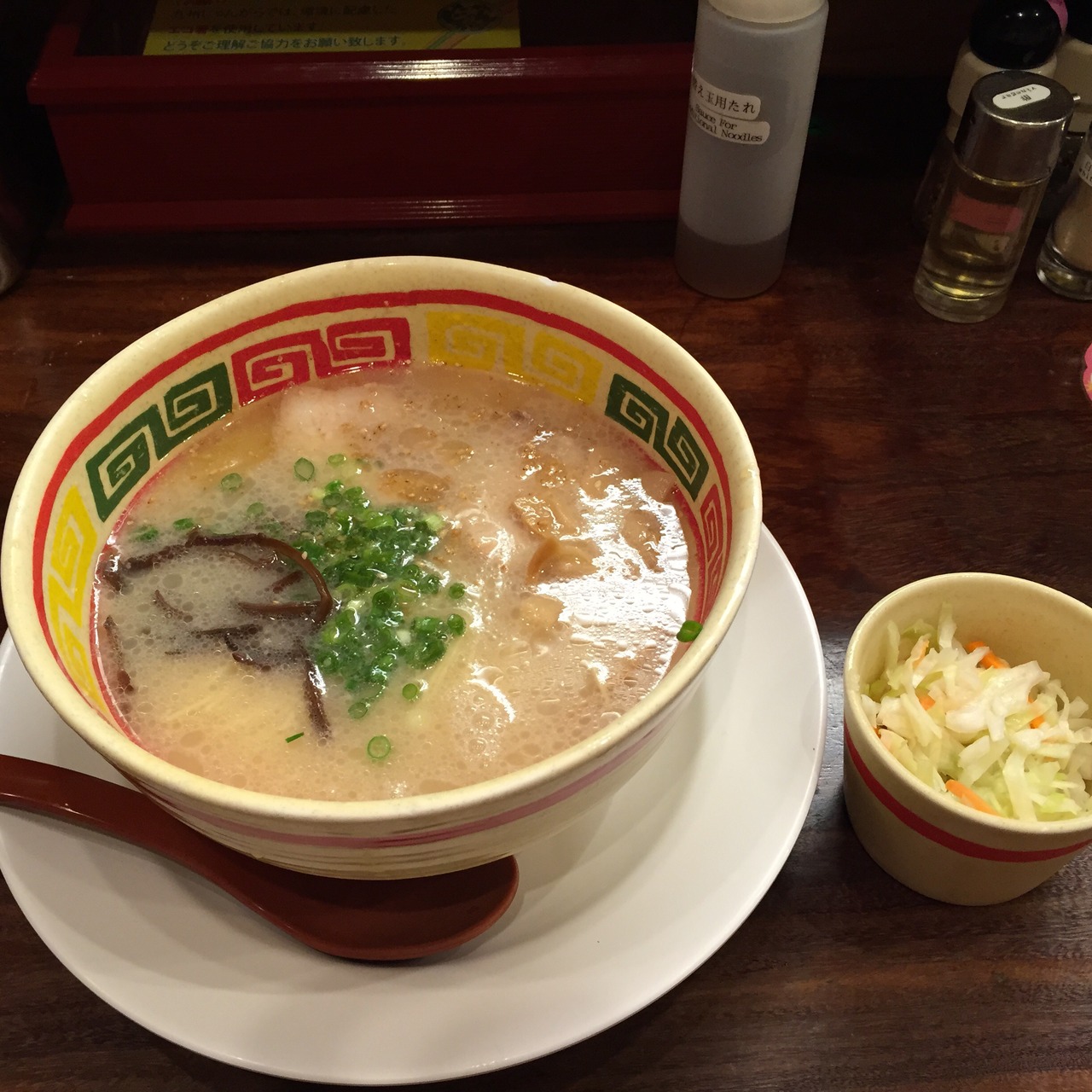 JR原宿・千代田線 明治神宮前、どちらからも徒歩1分。味は「九州じゃんがら」は、あっさり系とんこつ。「ぽんしゃん」は、こってり系とんこつ。どちらもオススメです!写真は、「九州じゃんがら」と「酢キャベツ」。多少並んでいても回転が良いので、あまり待ちません。