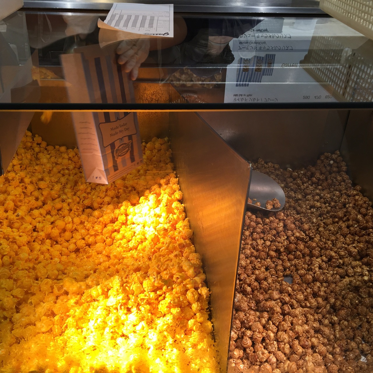 JR原宿・千代田線明治神宮前、どちらからも徒歩1分。どれを買おうか迷ったら「シカゴ」がオススメ。キャラメル味とチーズ味のミックス。店内で待っている間に試食ができます。袋入りの賞味期限は本日中なので、買いすぎ注意です。時期にもよりますが、翌日まで持ち越すと湿気て味が落ちます。缶で買えば10日間もちます。
