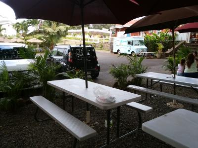 13:28 店の前の通りで食べている人もいましたが、ロイヤルハワイアンセンターのフードコートにお邪魔させてもらいました!