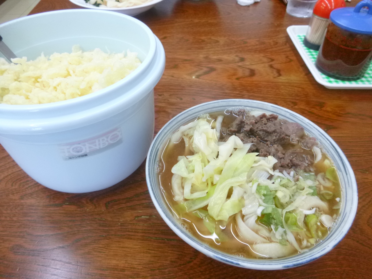 テーブルの上に置かれている天かすをパラパラっと投入しズルズルっ!