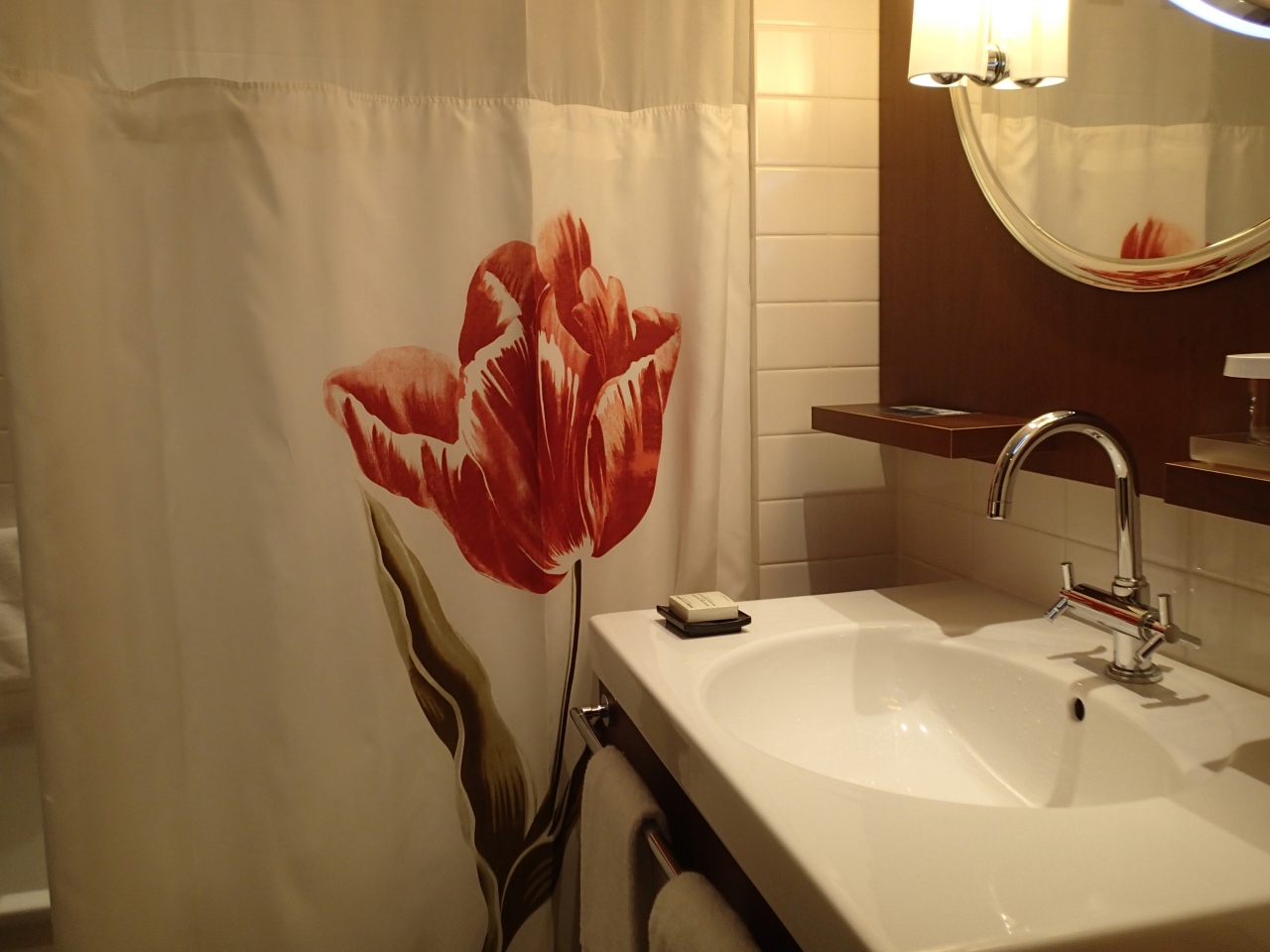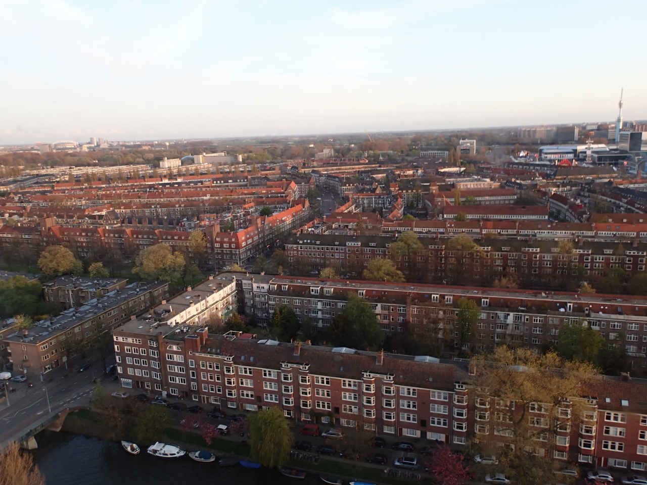 部屋の設備は満足のいく内容。部屋のドアを開けると正面のカーテンが自動で開き、街並みが美しく見える。アムステルダム中央駅からは、タクシーで15から20分程度かかる。周囲には、徒歩5分程度で買い物スポットがある。