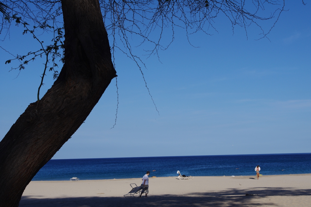 朝の8時ころ訪れました。波は静かでゆったりしています。早い時間なので、人影はまばらですが、散歩をしている人で泳いでいる人はほとんどいませんでした。デッキチェアーに座っての~んびりコーヒーを飲みながら海を眺め気持ちがよかったです。