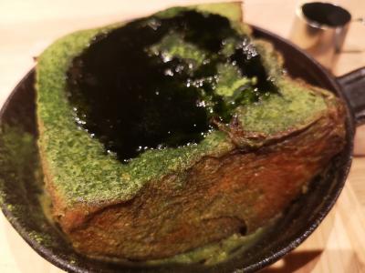 抹茶のフレンチトースト。濃い抹茶の味、しみしみのジューシーふわふわな食...