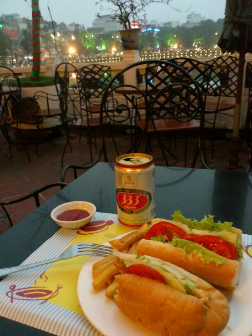 テラス席でバインミーと555を。だんだん灯りが点っていく湖畔が綺麗です。