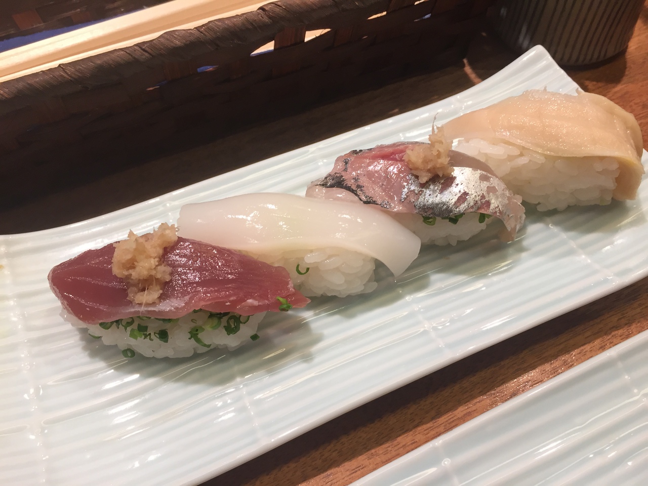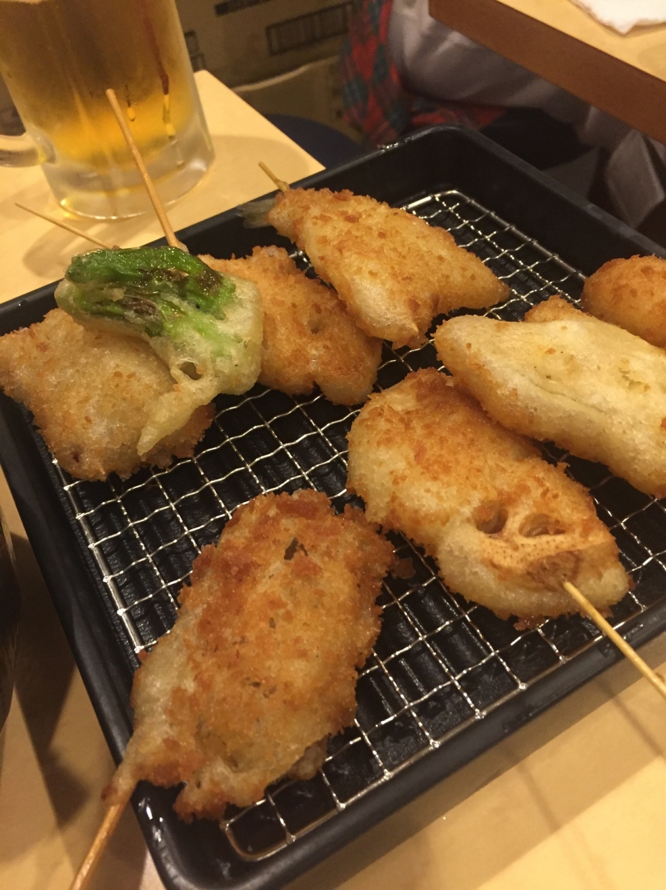 ホワイティうめだの地下街にあり、場所も便利です。立ち飲み、テーブル含めて席はけっこうるのですが、常に混んでいます。生ビールと串揚げの盛り合わせセットがお得でした。夏らしい鱧や鮎もとっても安くて驚きました。。