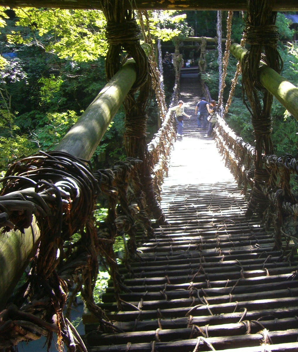 山あいの緑がとても美しい渓谷にかかるつり橋です。結構粗く編んであって、下がみえるようになっているので足の置く場所にも気を使い、意外と恐いです。毎晩19時から21時にはライトアップも行っているそうです。