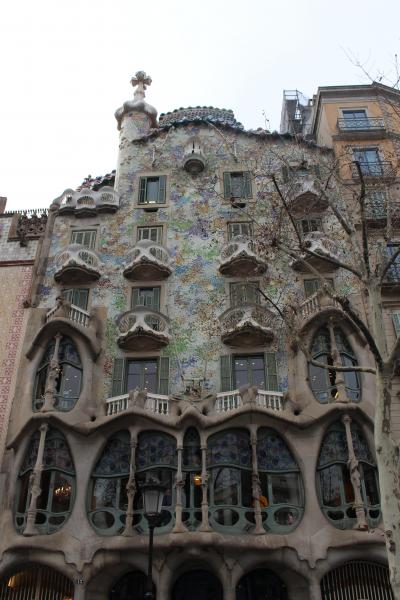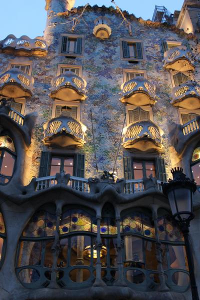 ライトアップされたカサバトリョは、骸骨のようなバルコニーが妖艶に浮かび上がり、窓に施されたステンドグラスも綺麗に見られました。