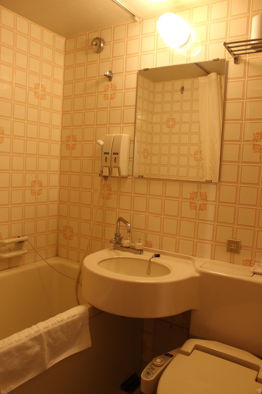 ビジネスホテルらしいシンプルなお部屋で、バス・トイレはちょっと狭かったのですが、ホテル内に天然温泉があるので夜は温泉を利用しました。