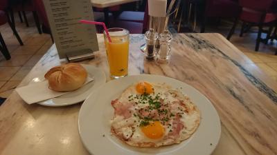 朝食メニューから、ハムと玉子料理+パン1個+オレンジジュースのセットを頂きました。