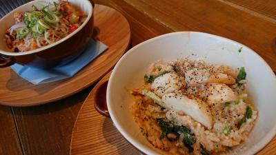 冬の期間限定メニューから『海老と冬野菜の豆乳クリームリゾット』と『あったかりんごとバニラアイスのパンケーキ』を。